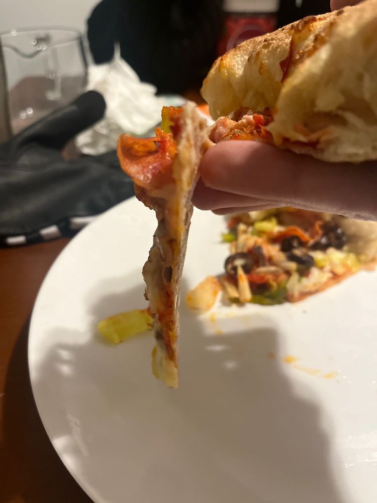 Parmesan crusted flatbread-style sandwich with alfredo sauce, cheese, Italian sausage, salami and banana peppers. Served with original pizza dipping sauce.